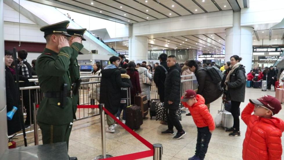 今天是春运第一天,武警北京总队执勤第三支队官兵在北京南站担负执勤任务。上午10点左右,战士申德鸿和汪贝的岗台前出现了两个小朋友,他们认认真真地向哨兵敬了个军礼后又鞠了一躬。执勤的申德鸿和汪贝也向他们回了一个军礼。回家过年,一路平安!(姜瀚 吴柯竺)